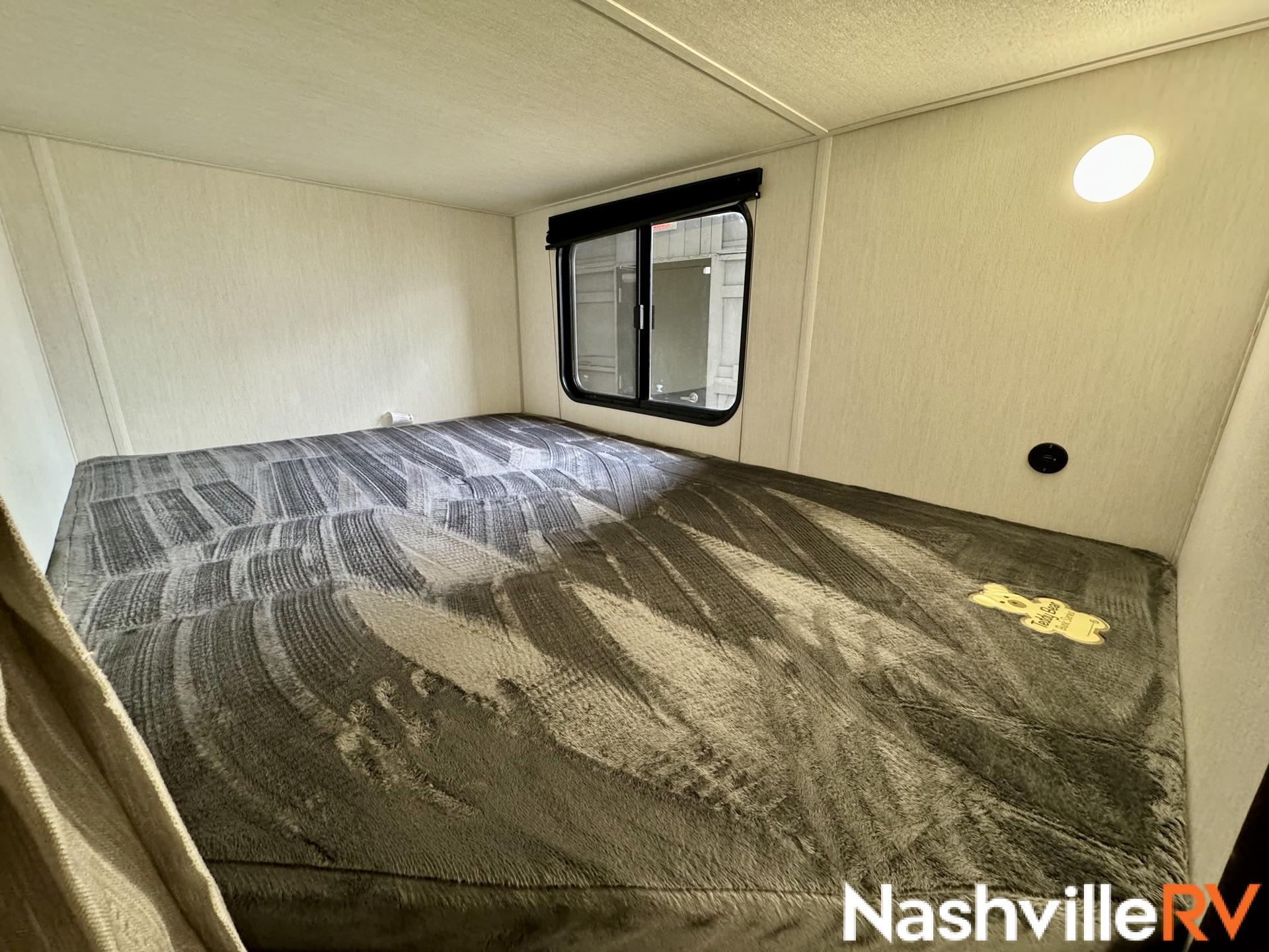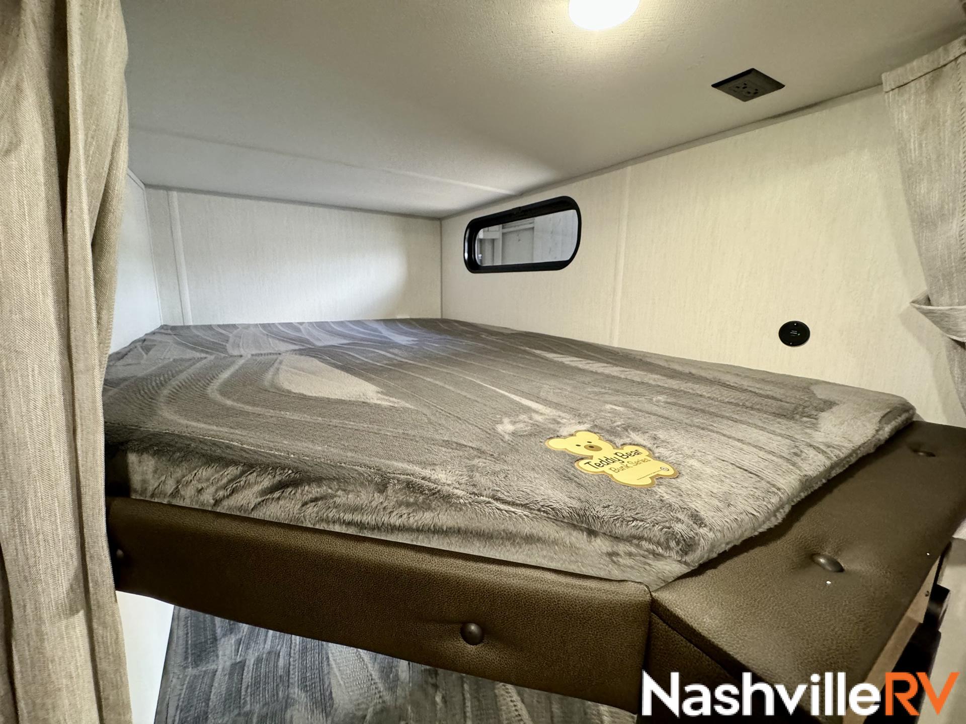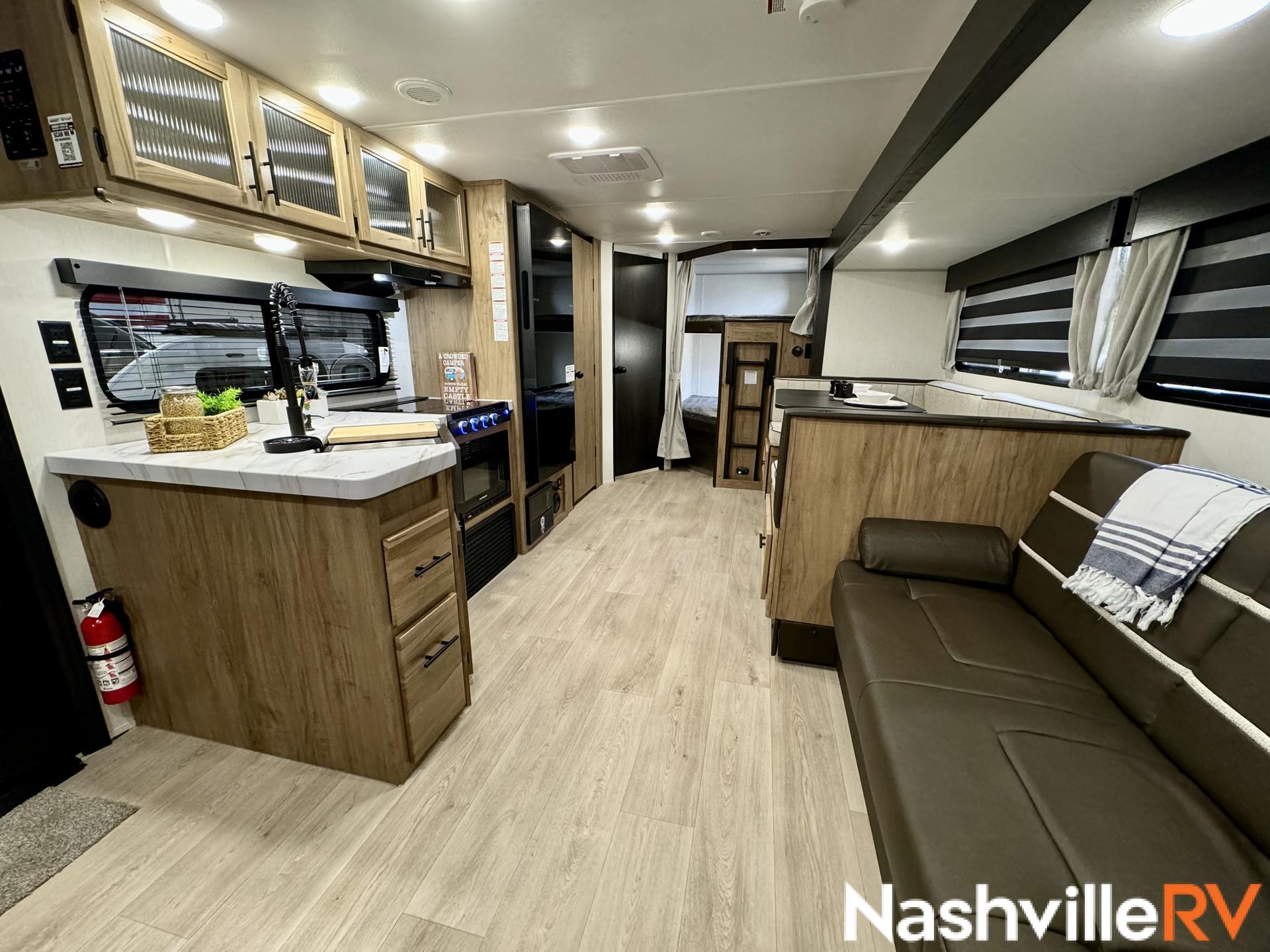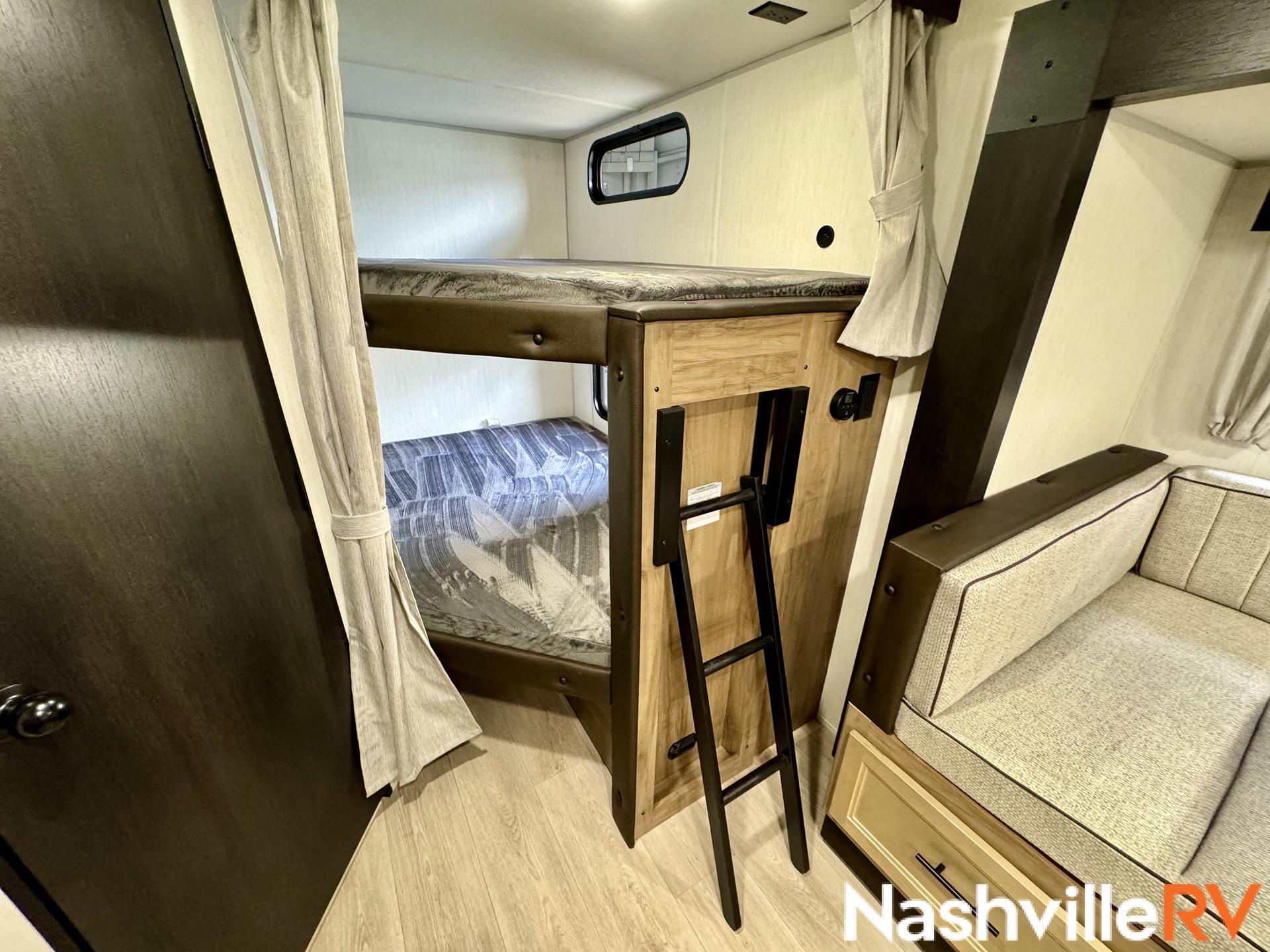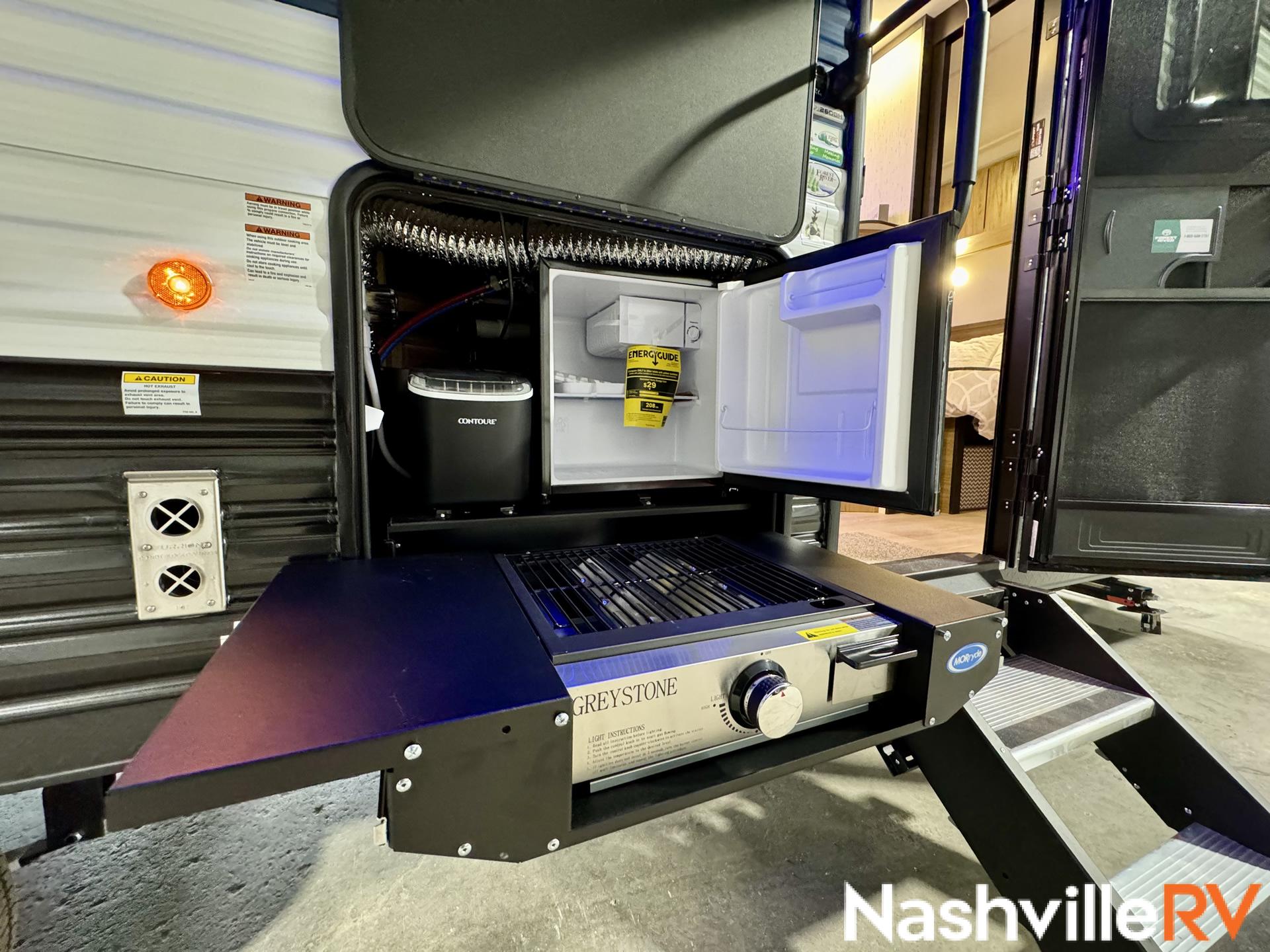 Our most popular travel trailer rental. Tow this travel trailer rental to your favorite spot and get ready for a great time. The whole family can sleep comfortably with a master queen in the front bedroom and 2 double beds in the rear. Our customers also love the exterior entry to the bathroom, huge pantry and the Electric Shade Awning with LED lights. Cook outside on the convenient outdoor kitchen with fridge. These trailers book up quickly so reserve your dates early!