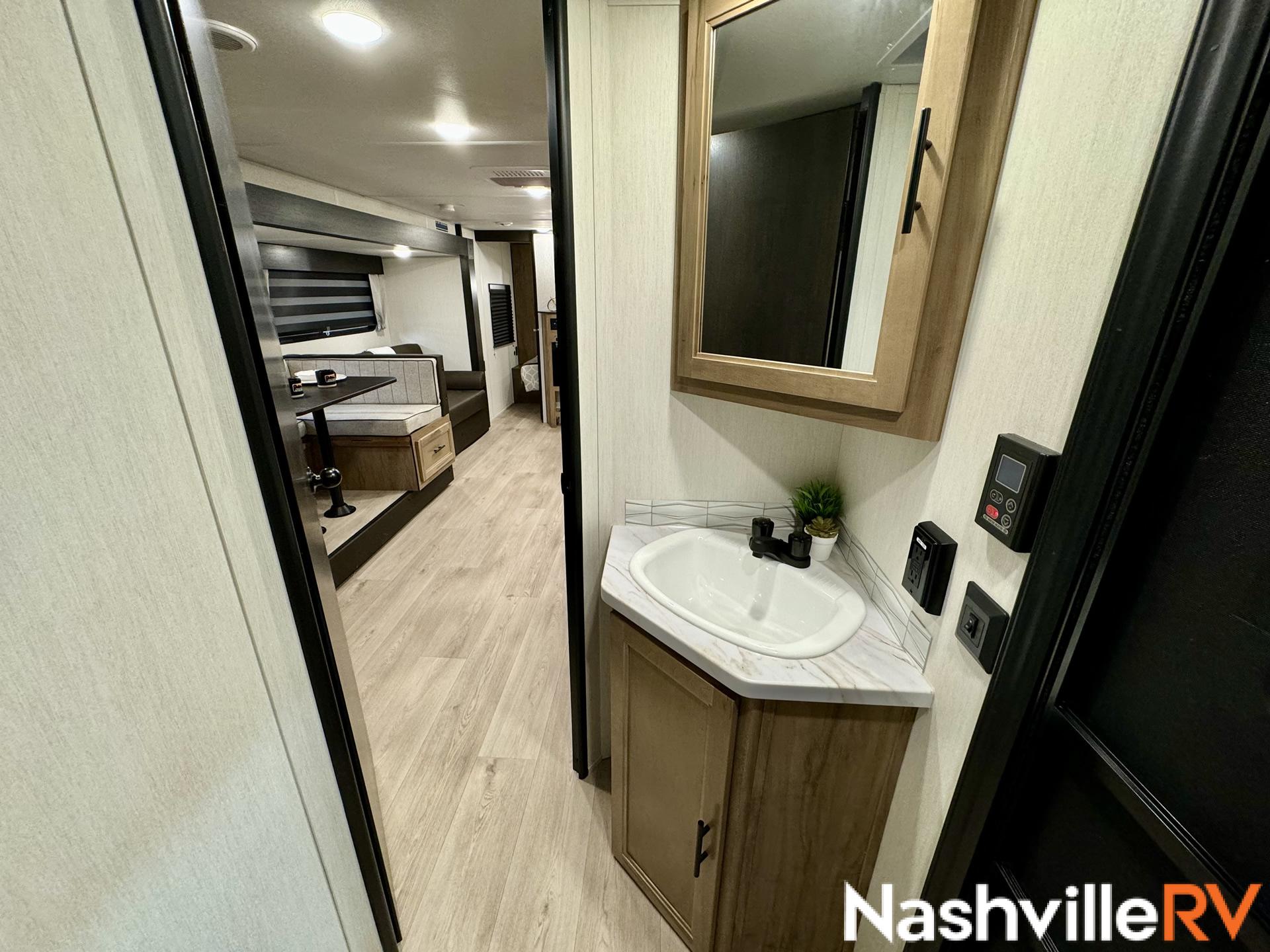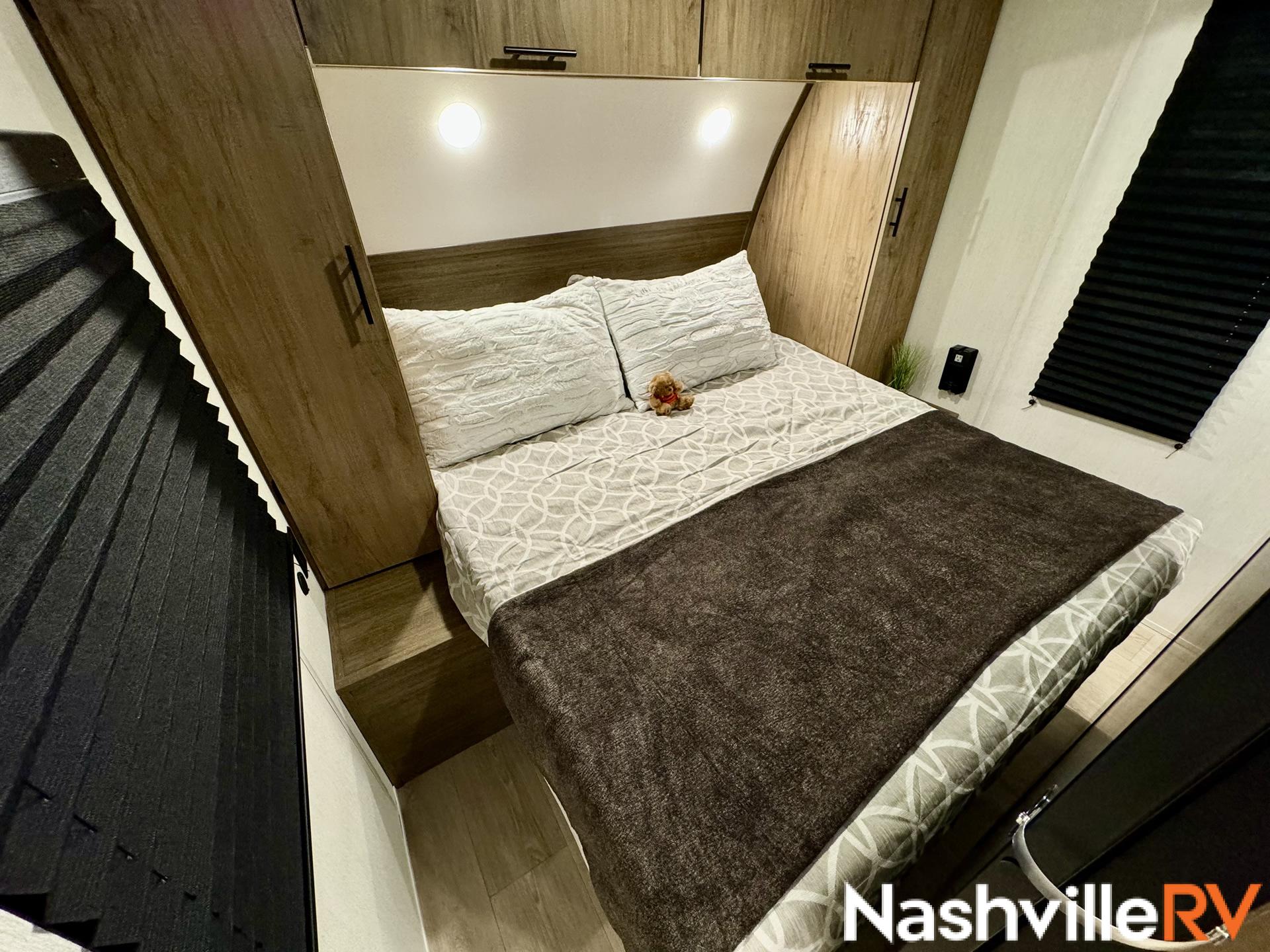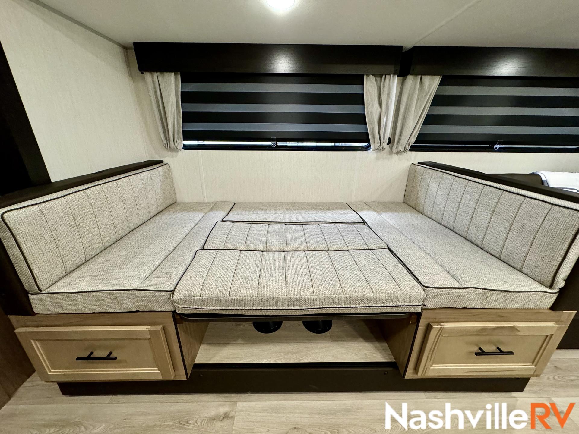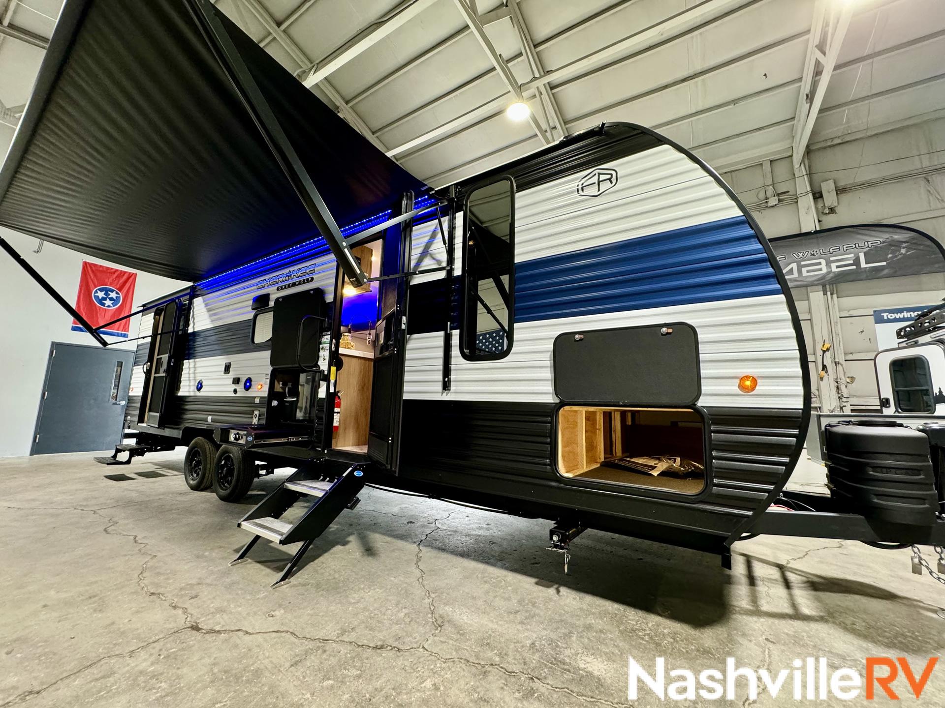 Our most popular travel trailer rental. Tow this travel trailer rental to your favorite spot and get ready for a great time. The whole family can sleep comfortably with a master queen in the front bedroom and 2 double beds in the rear. Our customers also love the exterior entry to the bathroom, huge pantry and the Electric Shade Awning with LED lights. Cook outside on the convenient outdoor kitchen with fridge. These trailers book up quickly so reserve your dates early!